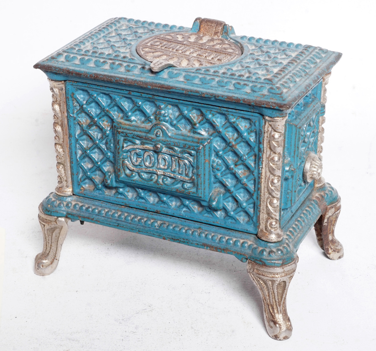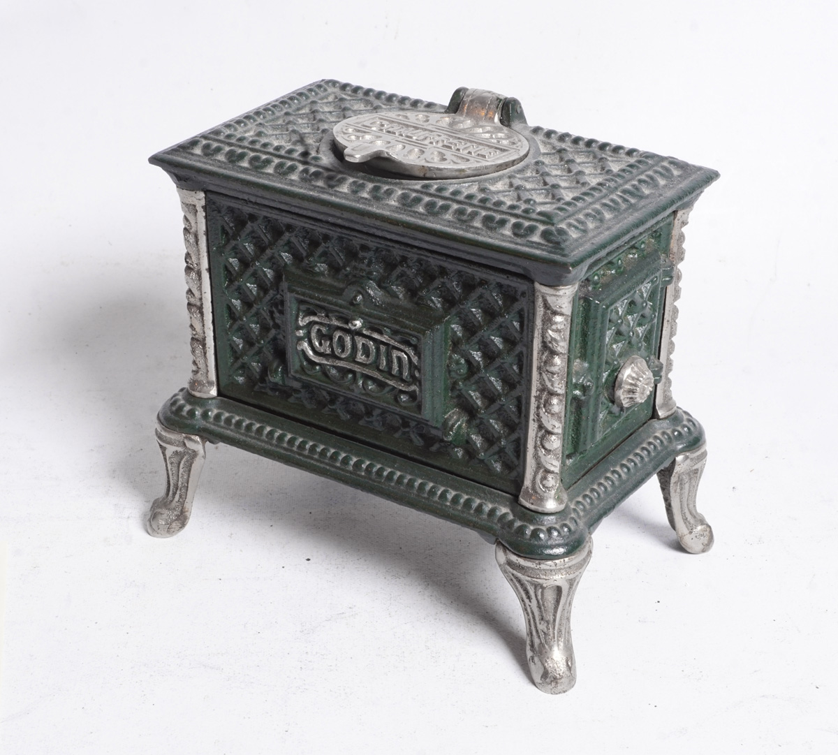 | Notice : | Outre les appareils de chauffage et de cuisson, les usines du Familistère fabriquent une multitude d’articles de quincaillerie en fonte de fer. En 1903, sous la gérance de Louis-Victor Colin, la Société du Familistère inscrit au catalogue de sa manufacture un premier objet promotionnel : un encrier sous la forme d’un appareil de chauffage en réduction (le cendrier n° 13, réduction du foyer hygiénique n° 5). Après la Grande Guerre, la fabrication d’objets promotionnels fait partie d’une stratégie publicitaire concertée. La commercialisation de nouveaux appareils de chauffage s'accompagne de l’édition d’affiches, de cartes publicitaires et de petits objets comme des encriers ou des cendriers. En 1925, le catalogue de la Société du Familistère présente deux nouveaux petits appareils de chauffage : le poêle à bois « La Chauffette » n° 299 (dont le modèle est créé en 1924) et le foyer hygiénique à charbon « Radiolette » n° 369. L’encrier n° 15, réduction de « La Chauffette » paraît dès 1925. L’encrier n° 16, réduction de « La Radiolette » entre au catalogue un peu plus tard, en 1927. Les deux objets sont encore présents sur le dernier album général édité par la Société du Familistère, en 1934. Les encriers n° 15 et n° 16 reproduisent fidèlement la forme des appareils de chauffage, mais leur fonte n’est pas ajourée. D’après les catalogues de 1924 à 1934, les objets sont livrés en fonte ordinaire ou en fonte peinte en vert mousse ou en bleu avec pieds, colonnes et valve de réglage en fonte nickelée. Les exemplaires conservés au Familistère de Guise ont également un couvercle et pour certains le nom « Godin » en fonte nickelée.