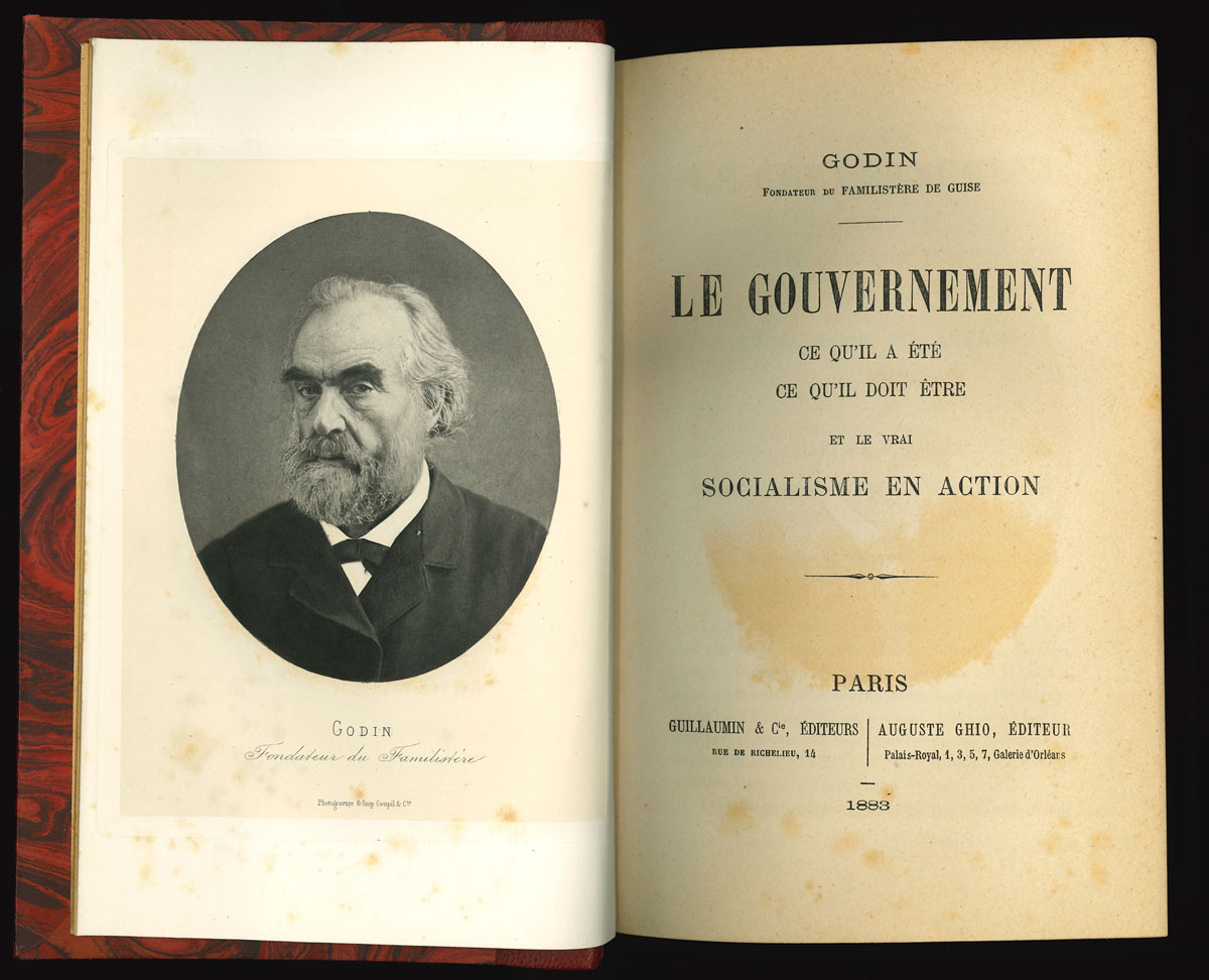 Frontispice et page de titre de : Jean-Baptiste André Godin, Le gouvernement, ce qu'il a été, ce qu'il doit être et le vrai socialisme en action, Paris, Guillaumin et Cie, 1883. Gravure du frontispice : Godin, fondateur du Familistère, photogravure et imprimerie Goupil et Cie (collection Familistère de Guise, inv. n° 2015-4-101.
